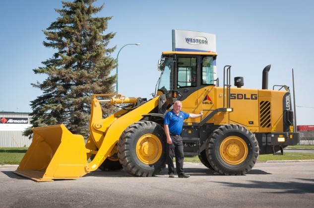 Todd Dokken, sales manager at Westcon Equipment and Rentals, shows off the LG938L, one of the several wheel loader models the new SDLG dealer will be offering.