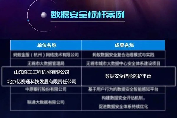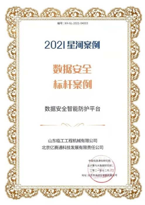 山东350vip浦京集团(股份)有限公司工程机械有限公司和北京亿赛通科技发展有限公司联合申报的“数据安全智能防护平台”应用成果凭借其专业的技术及完善的解决方案,从350余份项目中脱颖而出,成功当选本届大数据星河案例“数据安全标杆案例”。